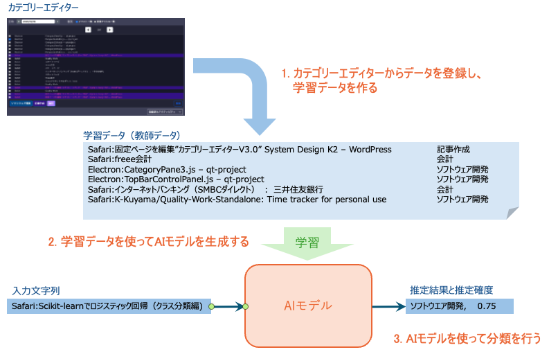 Quality-Workでは、仕事をどのように分類するかはユーザーが自分で決めるという考え方になっています。ビュー&カテゴリーという単位をユーザーが設定して分類を行います。従って分類方法もユーザー毎に違ったものになり、ユーザー毎に異なるAIモデルを作りこれを使って分類を行います。